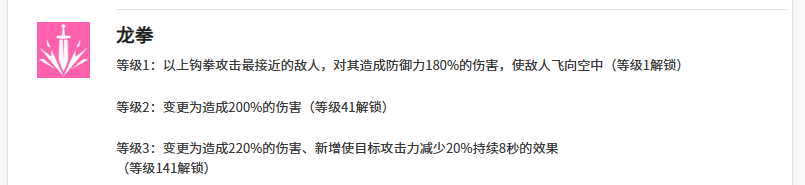 龙拳这个辅助技能对于克罗伊来说是一个主动攻击的能力,在其中带来攻击的动作是一个上勾拳,此时对敌人攻击根据她百分比来计算的话,是提取防御力当中180%的数值来进行伤害,此时敌人还有一定的概率会被克罗伊给击飞,后期就能在升级之后更好用,这里还可以让敌人攻击力减少20%,而在他的被动技能效果上面有一个不屈不挠的意志,这个技能可以根据目前克罗伊所在位置来进行触发,如果克鲁伊当前是敌人集火攻击的目标,那么此时她可以带来的这个能力就可以被动触发,让克罗伊在体力低于35%的时候,生效时间之内物理抵抗属性上面增加40%的属性之后,魔法抵抗同样也增加这个数值,然后再恢复体力上限7%的效果之后,克罗伊还可以带来足够的回能,当然这个回能效果虽然好用,就是一场战斗里面是只能用到一次的。、