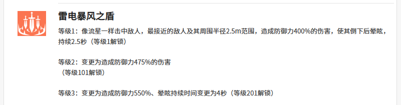 在终极大招效果上面,克罗伊可以用到的能力是雷电暴风之盾,这个技能同样也是快速给敌人进行攻击,此时接近到的这个敌人,根据他周边2.5m范围之内的范围,可以造成防御力上面400%的伤害数值,如果敌人倒下的话,那么后期这个眩晕能力施加成功还可以持续2.5秒来影响敌人的效果,所以克罗伊能够利用终极大招进行输出的话,数值有一些提升的同时,她这里施加的控制,大家可以用作连接后期其他技能效果的中间招式来使用。