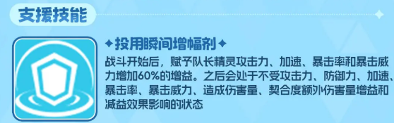 而支援技能效果上面是在战斗一开始的时候,瑞贝卡身上就可以根据她的队长身份带来一定的攻击以及速度加成,另外在暴击概率以及威力效果上面达到了增益之后,同样是60%之后的话,瑞贝卡自身也会不受攻击防御速度各方面的一个数值限制,此时只要契合度达到的话,她的额外伤害量是会有一定增益效果的,所以瑞贝卡不会受到对面很多控制角色的影响。