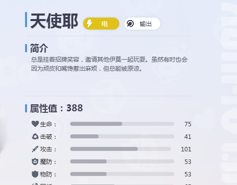 天使耶的基础属性还是比较亮眼的,总属性是388在同等级的角色中拥有突出的表现。还有75点生命值,可以保证他在战场上的续航能力,41点击破属性,让他在面对高防御的敌人时,就可以撕开防线。101点攻击属性就成为了核心的优势,搭配53点物理防护,还有魔法防护加上65点回能的高效能量积累,不管是持续作战还是正面输出,都可以从容应对。电能激荡可以让造成的原属性伤害提升12%强化输出的能力。雷翼姿态无论是普通攻击还是命中目标都会积累契约,30层之后马上就可以触发。