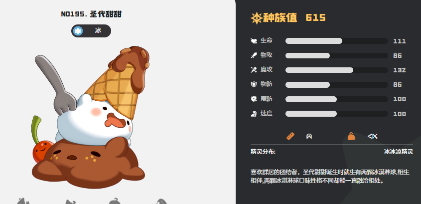 圣代甜甜的话,放在阵容当中负责的就是控场能力,因为只有当前它的速度效果能达到105,刚好可以比很多对手的效果更强势一些,所以当前他的新手是非常关键的,利用它的特性效果也可以让前面卡瓦重用雪地能力的时候带来更多的冻结加成,这里基础是可以多叠两层冻结的,技能效果上面大家可以带贯手以及霜天,此类技能效果如果遇到的是毒系对手的话,那么其实也可以保证让圣代甜甜的防御效果更强一些,搭配冰钻布鲁斯是因为它可以专门锁住对面换宠的机制,只要对面在叠到5层冻结之后,它拥有自身特性挽留效果,就可以让对面没有办法更换精灵,同时在此时还可以利用最后一个位置的化蝶带来一定的摇篮曲技能效果,让对面在技能能耗堆到10层以上的时候,对面就没有办法释放自己的技能,而且状态效果当中也出不来,最后这里搭配的化蝶基本就是跟冰钻布鲁斯放在一起用了。