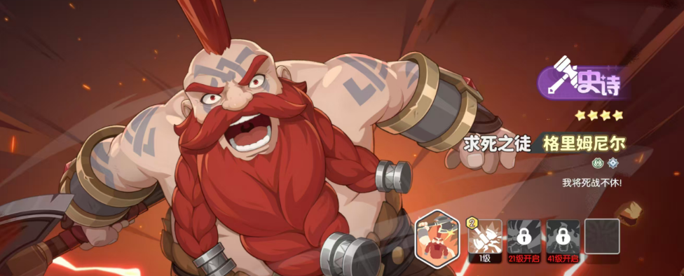 第三个为大家推荐的史诗角色叫做格里姆尼尔,格里姆尼尔在当前的使用效果当中可以造成的攻击效果最好是连续攻击同一目标,那么这样的情况下,就可以快速对这个目标造成伤害的时候带来19%攻速的提升,而且在最多的时候是可以叠加到10层,所以这个无所畏惧的天赋给他带来的叠加层数是非常高的,总结起来的话是有190%的整体攻速加成,后期在变更另外一个目标进行输出的话会直接清零,所以在前期建议大家找一个最重要的输出角色,作为他输出的固定目标,后期再处于狂野状态的时候,那么这里格里姆尼尔就可以带来自身奥义消耗量生命减少一点的节能效果,放在这里使用的话,他其实在高空当中有更多输出优势,可以快速的发动重劈对敌人进行270%的物理伤害。