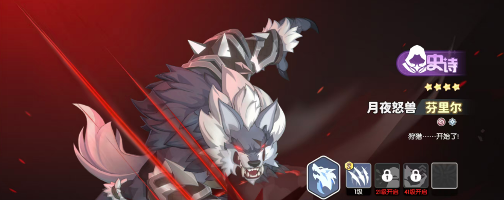 第二个为大家推荐的史诗级角色就是芬里尔,芬里尔当前使用的技能效果当中可以带来的恢复能力是非常具有天赋强度的,这个技能可以让他在场上存在一些血量低于一半的地方目标时,可以根据他这里的生命数值来进行32%的生命转化,另外如果触发了这里状态效果的话,那么此时就要成功击败这个目标,芬里尔就可以快速重置自己的技能冷却时间,每次在我放角色释放大招之后,芬里尔他身上就可以获取一层唤醒的状态加层,一层唤醒状态获取小号的话是可以额外提升分离,而身上4%的生命转化能力,所以放在这里可以通过各种技能来进行转化的话,芬里尔的技能效果也是非常突出的,后期还可以利用追猎时刻技能来造成打断对面输出伤害的方式,造成更多的团队配合效果。