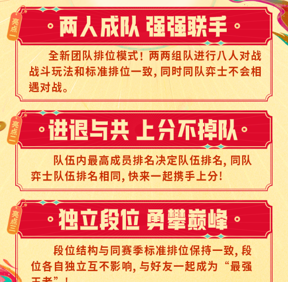 全新团队排位模式!两两组队进行八人对战战斗玩法和标准排位一致,同时同队弈士不会相遇对战。