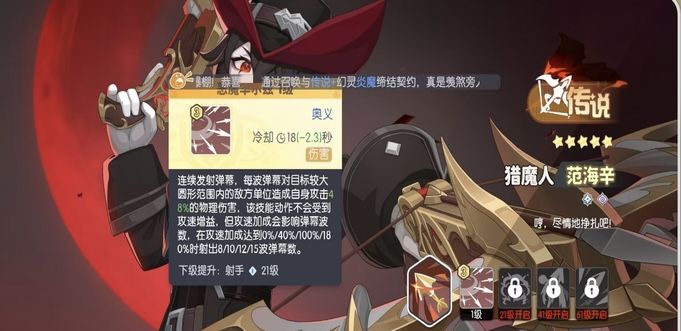 猎魔人范海辛这个角色,系统非常的强悍,首先就是迅捷射击,可以帮助玩家们释放技能,还可以提高12%的攻击速度,这个技能最多可以叠加10层,后续还可以降低奥义的能耗,还有一个和技能可以释放恶魔的华尔兹,来发射弹幕,这个技能可以造成58%的物理攻击能力,攻击速度非常快,弹幕的数值更高。