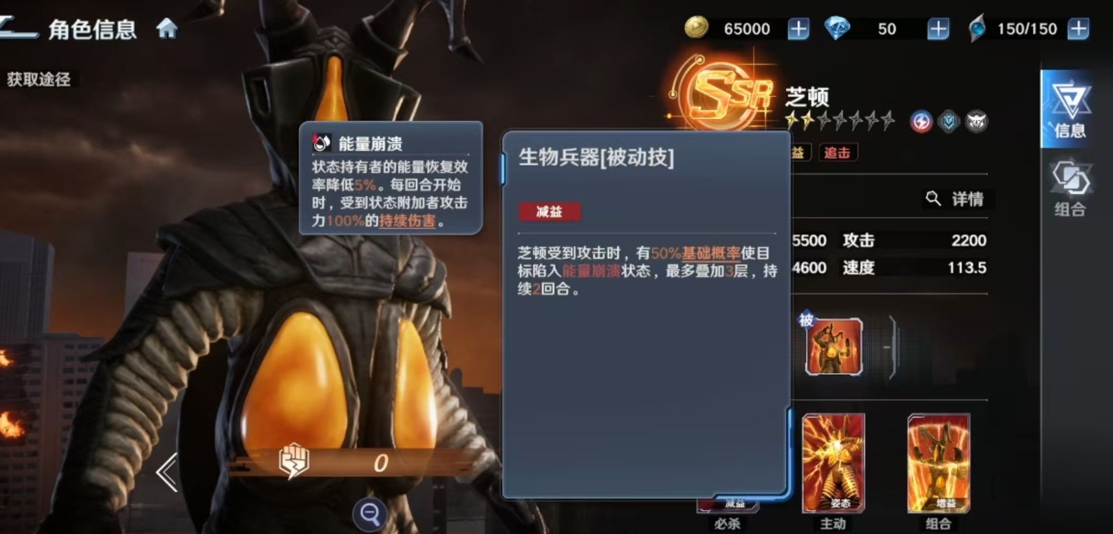 其被动技“生物兵器”具备独特能量干扰机制:每次受击时,有概率使目标陷入“能量崩溃”状态,该状态最多叠加至三层;每层均降低目标能量恢复效率,并在每回合开始时触发固定数值的持续伤害。该效果虽非爆发型输出,但对敌方能量循环形成实质性压制,大幅延缓关键技能释放节奏,强化芝顿作为战术支点的战略意义。
