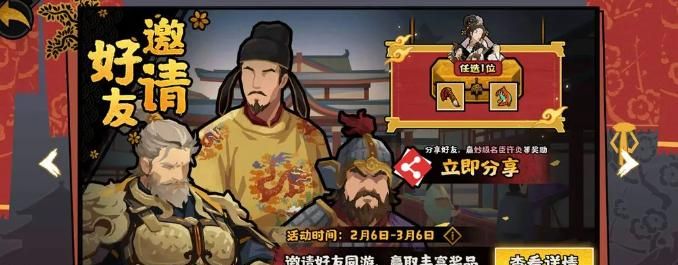 上线全新社交激励机制,成功邀请指定数量新玩家注册并达成活跃条件后,可领取妙级名臣自选宝箱,内含许负、许慎、桓伊、伯牙、子期五位功能型名臣,覆盖占卜、典籍、音律、外交等多元领域,有效缓解新手期阵容成型压力。