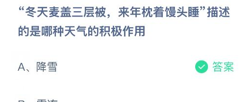 以上就是“冬天麦盖三层被,来年枕着馒头睡”描述的是哪种天气的积极作用?支付宝蚂蚁庄园2026年2月6日答案最新,更多相关攻略,请关注3dm手游网更新!