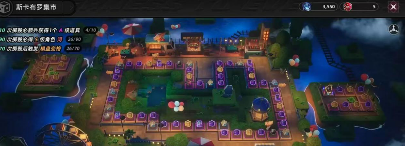 进入集市之后,玩家会看到一个很大的棋盘界面,上面密密麻麻分布着各种格子。抽卡的方式不是直接点击十连或者单抽,而是通过投骰子来决定前进的步数,投出几点就往前走几格,走到哪个格子就能拿到那个格子上的奖励。这种玩法有点像小时候玩的飞行棋,但是奖励可比飞行棋丰富多了,角色、武器,各种材料都有可能获得。