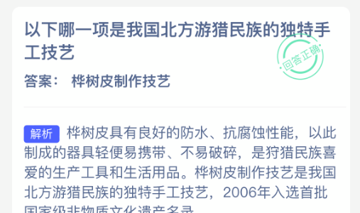 以下哪一项是我国北方游猎民族的独特手工技艺?【蚂蚁新村每日一题】2026年2月9日题目已发布!坚持答题,积累木兰币,即可加速小镇建设。答对本题,立即可享“产速+3/时”的加速奖励!今天正确答案是【桦树皮制作技艺】。桦树皮制作技艺是我国北方游猎民族的独特手工技艺。
