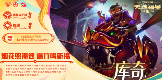 在2026福星守护神活动中,库奇的解锁条件是:在8级或以上时,完成【龙魂】弈子进行50次龙焰爆裂。作为福星守护神/龙魂单位,其技能可发射烟花造成范围物理伤害与护甲击碎,并为随机敌人挂上小爆竹,爆炸后可处决低血量目标。
