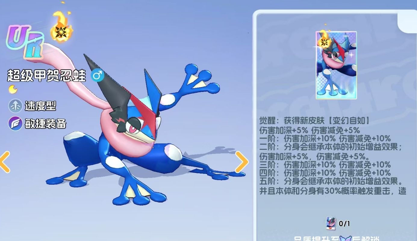 与其他的UR宝可梦一样,超级甲贺忍蛙在完成MEGA进化后,同样会多出一个觉醒技能,其形态也会发生改变。觉醒技除了能为超级甲贺忍蛙提供增伤和伤害减免外,还能令它在释放影分身后,令影分身继承本体初始的增益效果,强化影分身的输出能力。如果能将MEGA进化突破到五阶,本体和分身在进行攻击时还有概率触发伤害倍率为200%攻击力的重击效果,并附带2秒的眩晕,当本体释放终结技时,分身也会跟着一起释放,即便此终结技伤害只有本体的30%,但也能极大地提升超级甲贺忍蛙的输出能力。