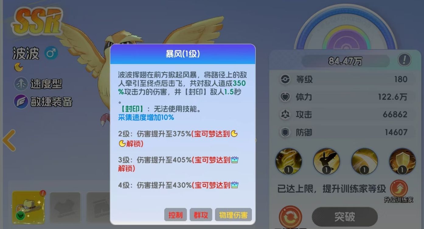 波波在宠物集结里是初始品级为SSR的宝可梦,它的定位为速度型,会在战斗中对敌人造成物理伤害。在1级时就能解锁的大招除了能让波波吹起风暴,令风暴路径上的敌人受到高额的伤害外,还能将它们全部击飞,并施加无法使用技能的封印效果,是一个兼具伤害与控制的技能。当波波达到11级时,它还能解锁自己的第二个技能,令自己能在开局时就飞到敌方后排进行突袭,配合上41级能解锁的空气斩,能让波波爆发极高的连招,快速削减敌方后排的血量。若敌方后排放的是以远程攻击为主的敌人,波波还能享受到被动的加攻效果,进一步提升自己对后排敌人造成的伤害。