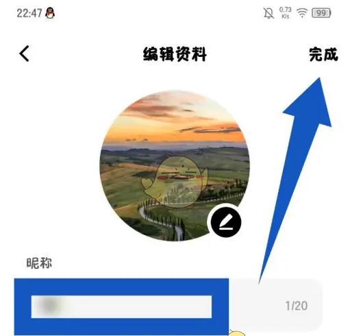 3、在编辑资料页面,输入新的昵称,点击【完成】。