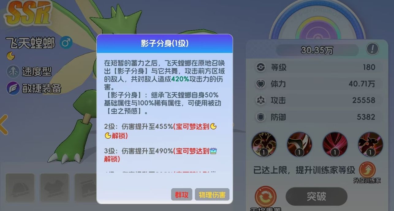 飞天螳螂在宠物集结里是速度型宝可梦,它可在怒气满后释放大招原地招出分身,并与分身一起对前方敌人进行协同攻击。所招出的分身在属性上会继承飞天螳螂50%的数值,且同样能获得飞天螳螂的被动虫之预感,可提升自身的攻击,并能在血量首次降至50%时,进入无敌状态1秒钟的时间。等飞天螳螂到达11级时,还可解锁新技能电光一闪,该技能可让飞天螳螂立刻突进至敌方后排宝可梦面前,并对其造成爆发伤害,且使用该技能时若出现了击杀敌方宝可梦的情况,还能立刻刷新再次使用。若飞天螳螂的等级达到了41级,还能再解锁连斩技能,可挥动前肢对敌方进行多段斩击,且释放期间自身会获得9999点闪避提升,几乎不可能会敌方击中。