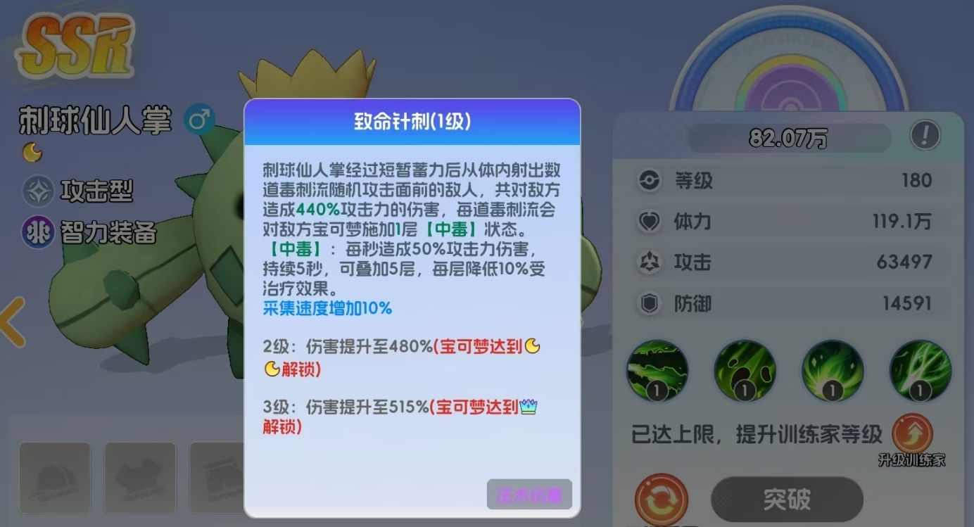 刺球仙人掌是SSR级攻击型宝可梦,隶属于风阵营,其攻击以对敌人造成法术伤害为主,且能通过多重手段为敌人施加中毒效果。释放终结技时,刺球仙人掌会向敌人喷射出毒刺,随机攻击处于自己面前的敌人,并对它们施加中毒效果。每道毒刺所造成的中毒效果都会独立计算,敌人每被毒刺攻击到一次,都会被叠加一层中毒,最多能叠加五层。受到中毒效果影响的敌人不光会受到基于刺球仙人掌攻击力的持续伤害,还会根据中毒层数降低自己所受到的治疗效果,每层降低10%,能变相削弱敌人的持续作战能力。
