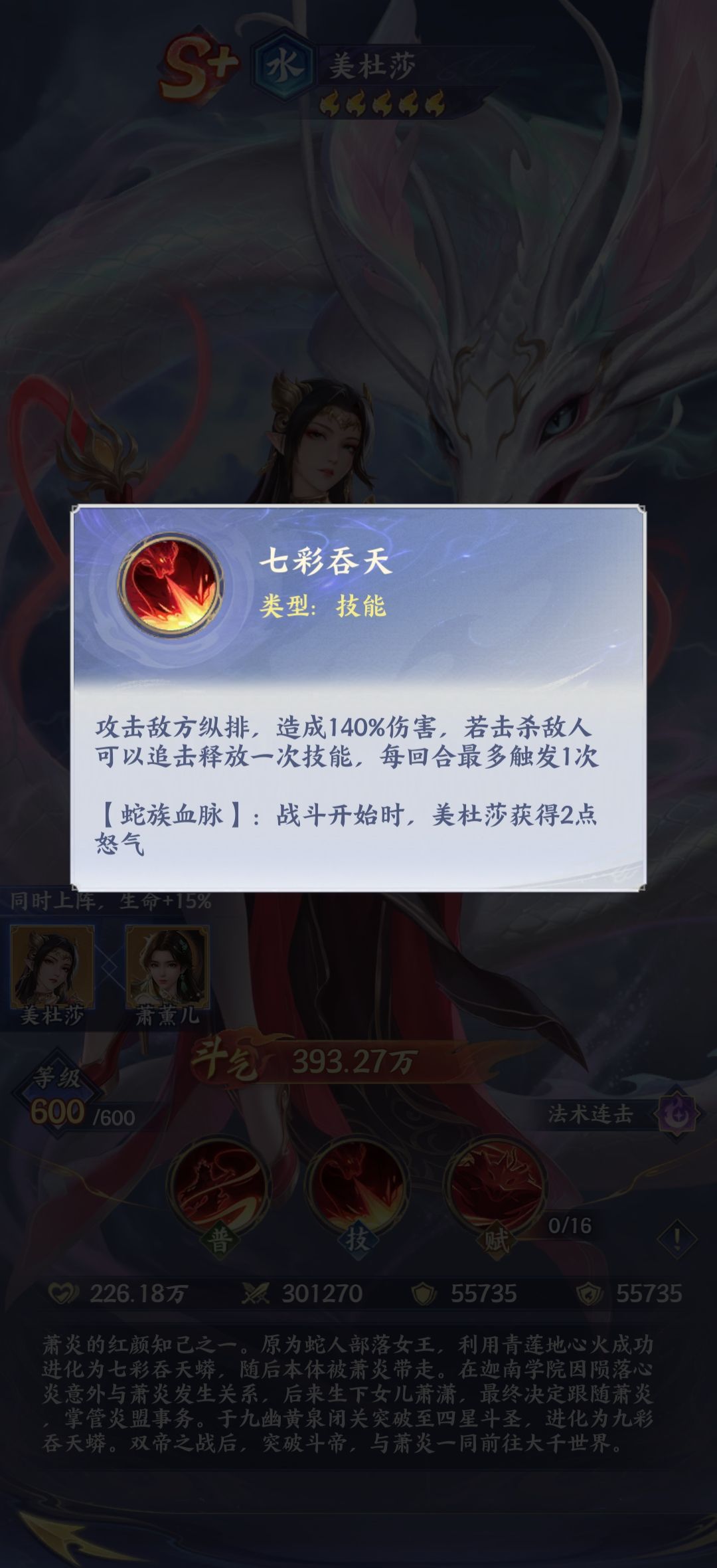 不得不说美杜莎的角色魅力也是比较强大的,而玩家如果合理的运用美杜莎之后,她其实也能够发挥着重要的作用。她作为橙卡具备广泛性,一旦搭配萧炎,萧薰儿直接组成双核爆发的阵容,这时候实力比较强悍。