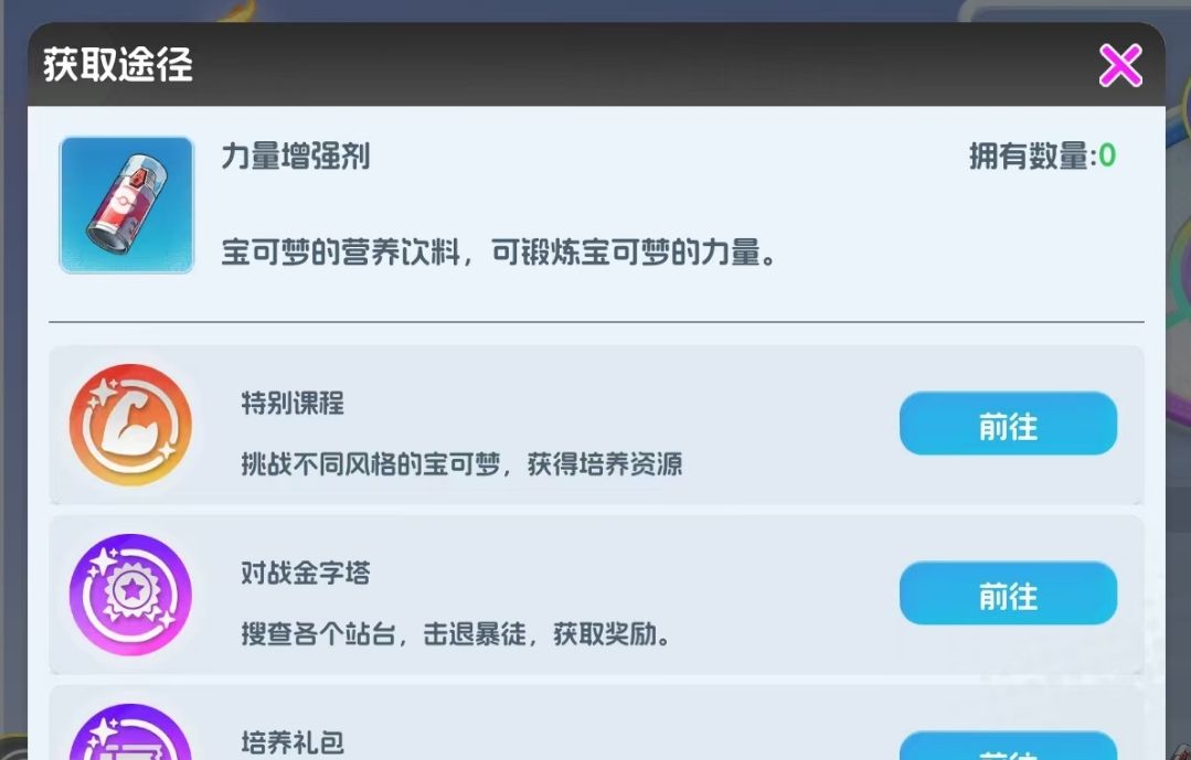 而养成资源的类型就比较多,能帮助宝可梦提升等级的宝可梦经验,可突破等级上限的神奇糖果,为装备升级升阶的强化石、进阶石等,都属于此类。它们的获取途径相当多,既有像挂机收益、日常任务、委托板等常规性功能,也有像每日挑战、精灵塔、特别课程等功能性玩法,玩家们在缺少任何一种资源时,可通过查看这些资源的获取方式,跳转至相应的玩法里去进行获取。同时,宠物集结也会开放很多活动,它们也是玩家获取养成资源的主要途径,各位记得多多参与,别将这些活动的奖励给错过。