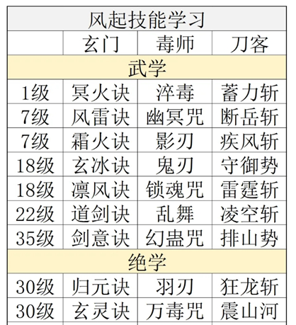 玄门(隐仙岛--桃林--桃丘),毒师(乌蒙泽--迷雾岭--试炼谷),刀客(牛家村--校场--习武场)