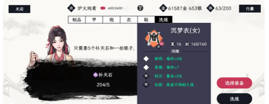 洗练的门道就在裁缝铺,还有铁匠铺。找到NPC之后就可以开启重塑装备的旅程。每一件装备的初始词条全部都是随机生成的,可能是物理性攻击加成,也可能是法防属性,一切都只是看个人的运气。通过洗练就可以让不如意变得可改变,只需要消耗5块补天石,还有少量的银子,就可以刷新词条的列表。从物理性攻击到法术攻击的属性中,找到一个让自己满意的搭配即可。