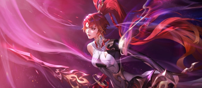 主题与设计:以宇宙守护为核心,花木兰化身跨次元界灵战士,融合未来国风元素。主色调为赤红、白黑,亮黄色勾勒轮廓;重剑由天狗幻化,轻剑萦绕赤昙流光,技能特效含花瓣状裂隙和天狗冲击动画。