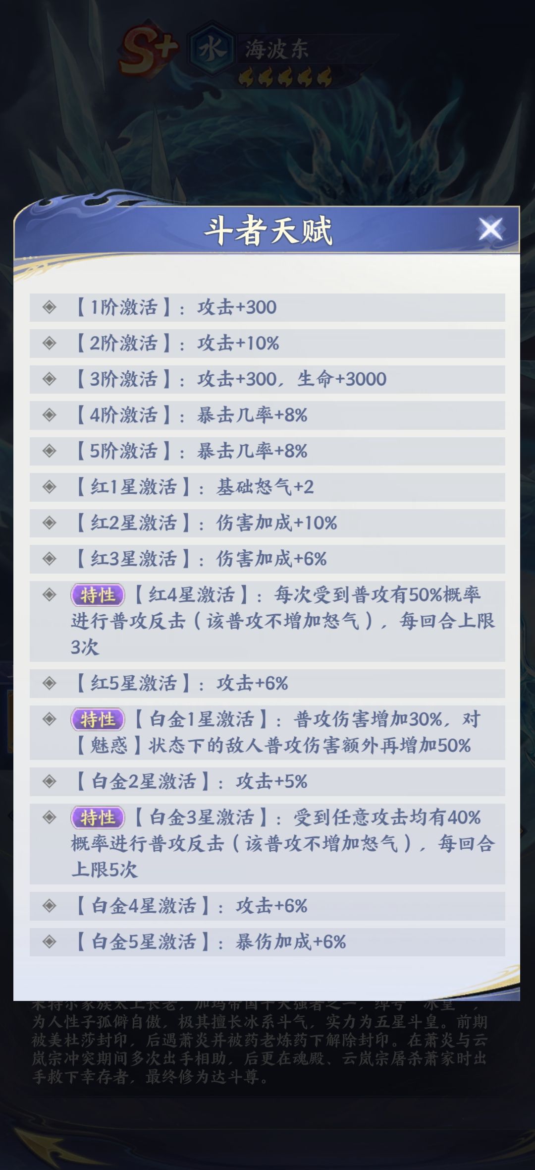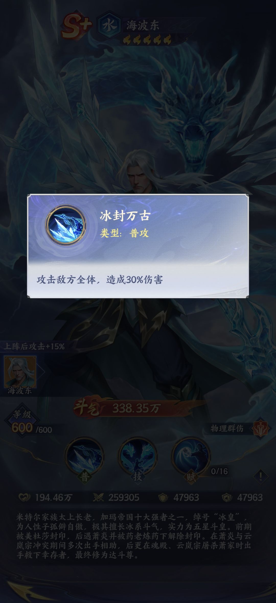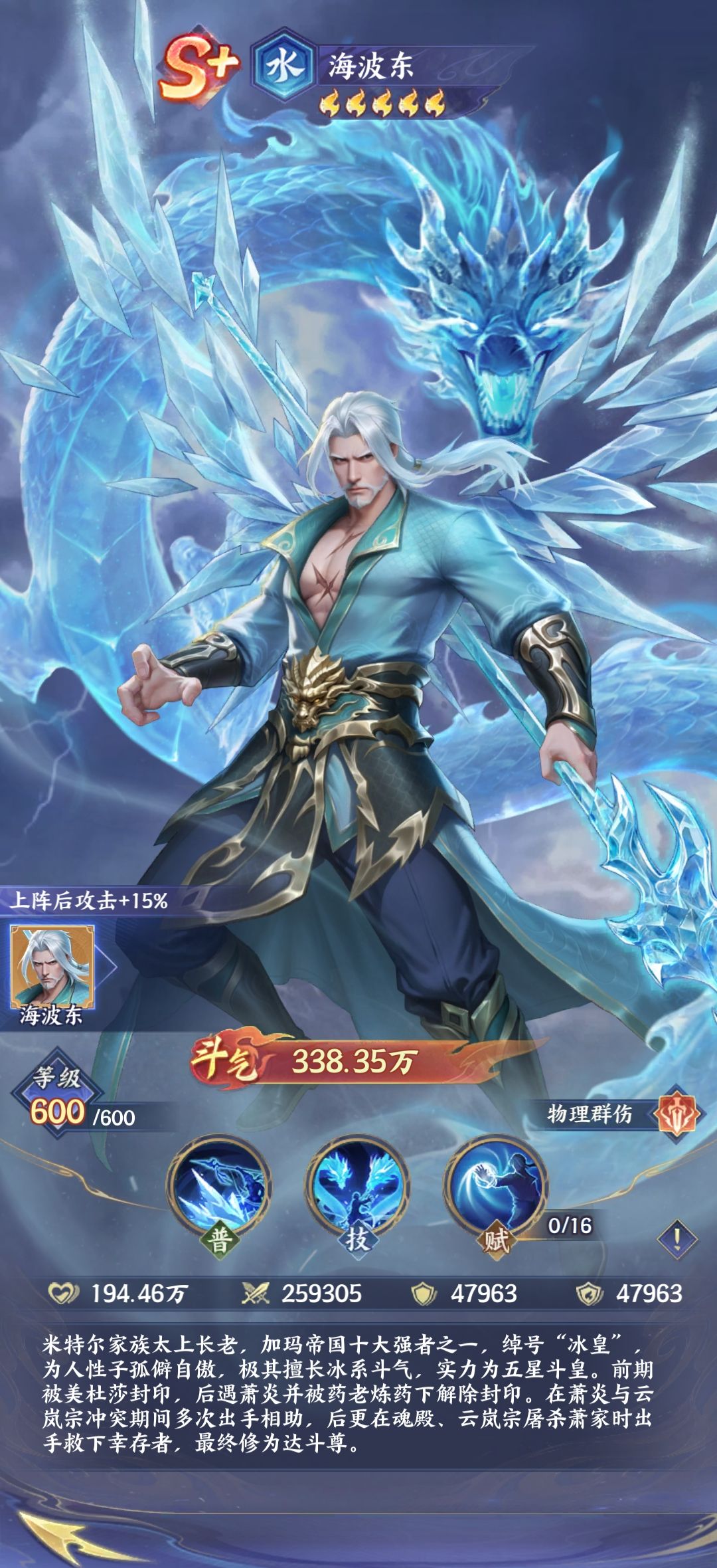 海波东在原著当中被称之为冰皇,其实他的实力比较强悍,作为S加级别的水属性,物理纯伤类型的斗者。对于玩家来说,他如果施展他的招牌技能也就是玄冰龙翔,一旦释放之后,将会对敌人的全体造成高额的伤害,并且这个技能攻击之后还会追加一次普通攻击伤害,简单来说,也就是在一回合以内就能够给敌人的全体造成了两次攻击伤害,在这样的情况下能够有效的达到清场的目的。其实更重要的是,他的这次普通攻击技能不会增加怒气值,但是能够让他更快的释放大招,这样的话就会形成持续性的压制,能够让全体的实力上升。