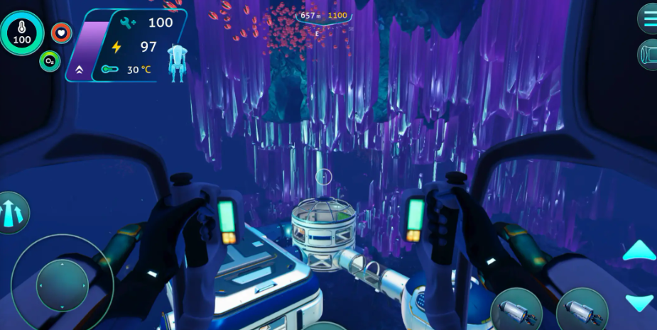 随后玩家们就可以直接前往水内开始探险了,在水面上会有极寒天气的影响,到了水面之下,玩家们就完全不用担心了,水下的物资还非常丰富,例如铅块一类的矿物,玩家们都可以获取,由于开局的道具比较少,所以玩家们开始的大型物资都是没有办法获取的,但是小型物资还是需要关注一下,当玩家们在水下之后,也要注意一点,那就是氧气,水下缺氧时会有提醒,此时玩家们就需要迅速上浮获取氧气。这一阶段直接前往吊舱就可以将氧气补满了,吊舱属于玩家们的基地,这里还有一个工作台,可以帮忙玩家们制作其他物品。
