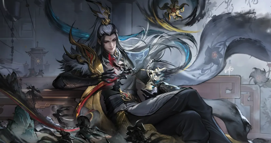 基于明世隐的形象特征和气质,我们以曼陀罗花为核心意象,塑造这位深藏不露的百晓楼主人。他银发高束,一丝不苟绾入曼陀罗花冠,冷寂中透出妖异。黑金华服间游走朱红丝线,似静似动,似雅似杀。宽袖垂云,金丝织就的披肩流光隐动,毛领外扩,气度卓然。