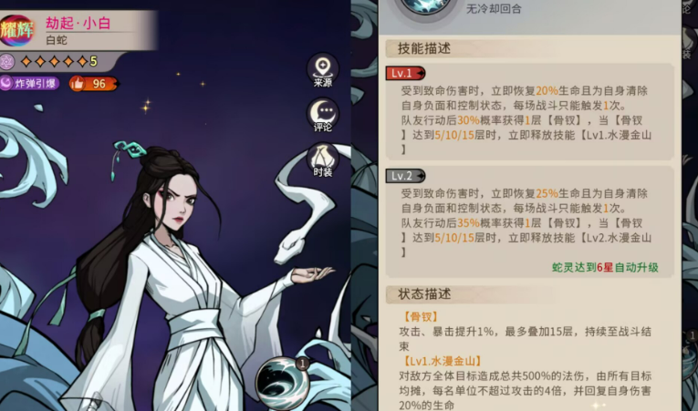 第二个被动渡劫之志,才是白蛇真正的核心优势。首先能保命,受到致命伤害不会直接死,还能回血清负面状态。这点大大提升了生存能力和反打空间,就算被集火也有翻盘机会。其次就是输出机制了,队友每次行动后,有40%几率,给白蛇叠一层骨钗。叠到5层10层15层的时候,就能释放水漫金山打全体aoe伤害。15层的伤害倍率,有700%法伤,配合队友高频率行动,能快速叠层释放多次aoe。