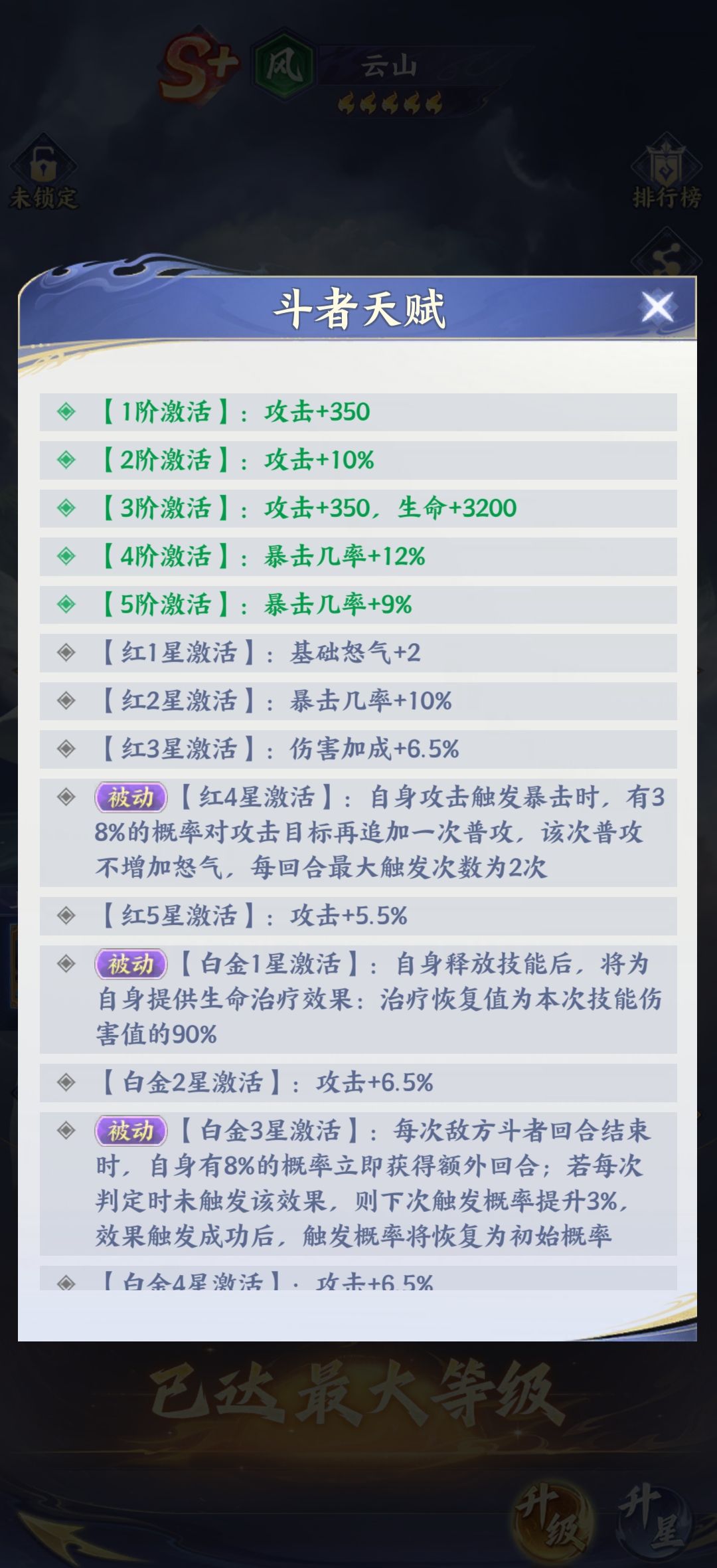 斗者天赋将极致输出,还有生存续航全部放在一起,从1阶到5阶,暴击率,还有攻击力都会稳定的提升。在红四星时暴击触发之后,还会有38%的概率追加一次普通攻击,每一个回合最多触发两次,让输出的效率就可以成倍的增长。在白金一星时释放技能之后,那就可以直接恢复本技能伤害大约90%的生命值,让他在战场中就可以越战越勇。白金三星的额外回合机制就能让他有机会在瞬息万变的战局中,可以抓住转瞬即逝的战机,然后去扭转乾坤。