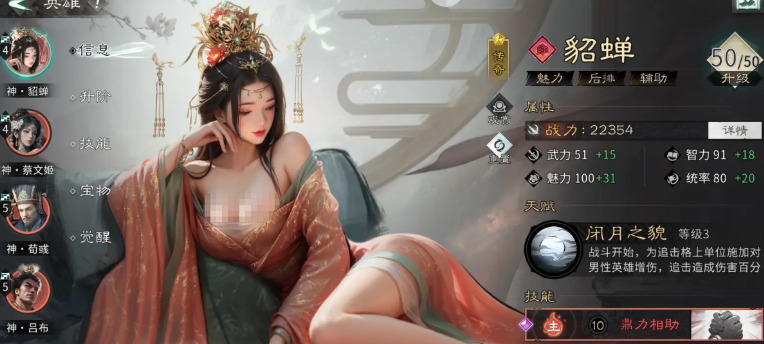貂蝉的天赋技能闭月之貌是一个可以提升等级的技能,这个技能可以让战斗在开始后,先给追击格上的武将附加上对男性英雄的增伤效果,追击时所造成的追击伤害将会直接变成百分百。