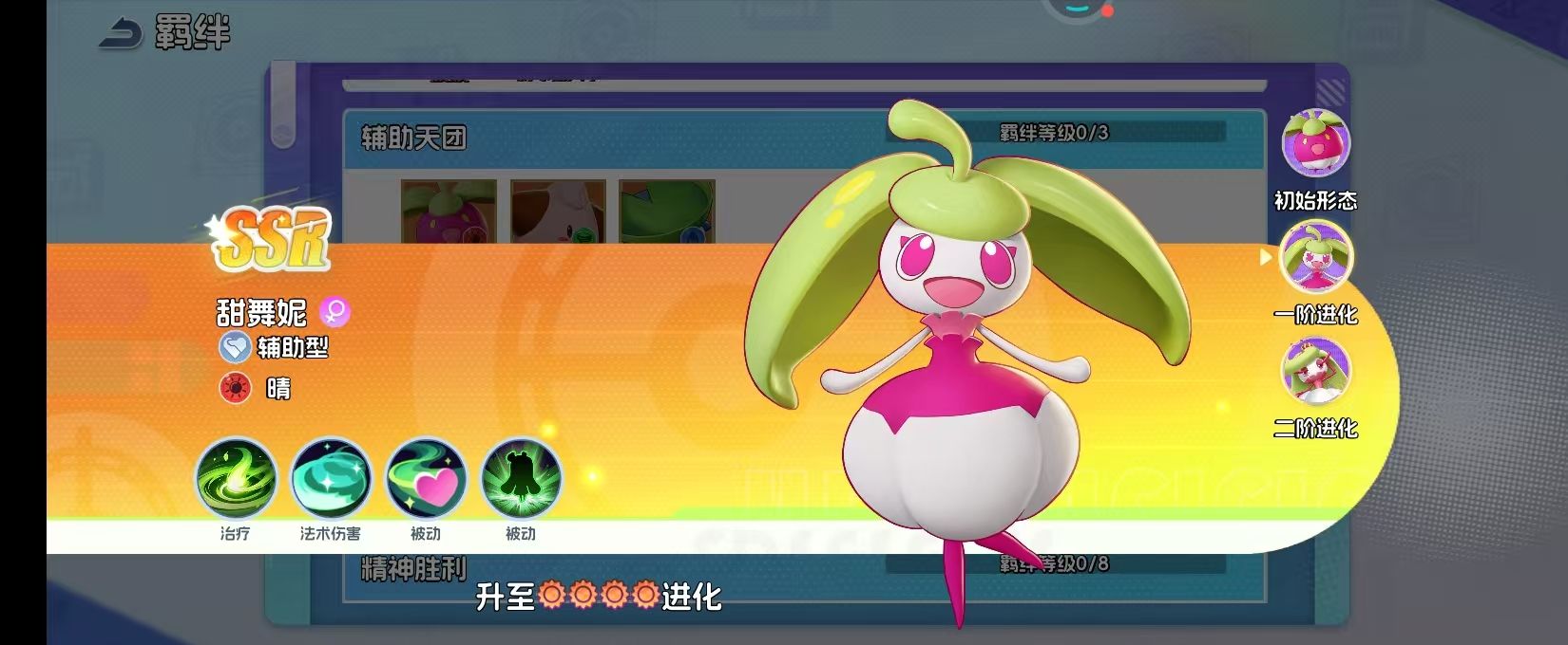 到了后期就会进阶成甜舞妮。这个时候就会没有一开始的稚气,而是拥有绿色的长发。开始会学习用一些具有攻击性的方式去保护自己或者是队友。每一次的攻击都会拥有热带阳光的灼热,每一次的旋转都好像是花瓣一样的优雅,并不再是躲在队友背后的那一个小果子,而是成为了一个舞者,能够独当一面。在无数次的战斗中都可以磨砺出坚韧的意志,最后就可以通过进化变成甜冷美后。