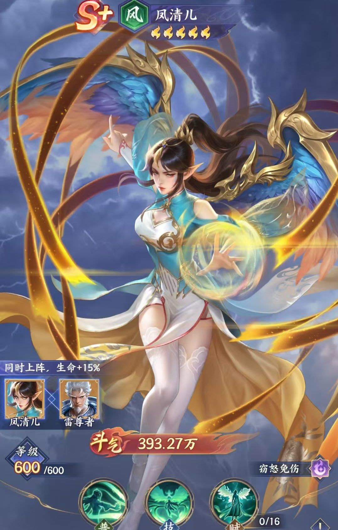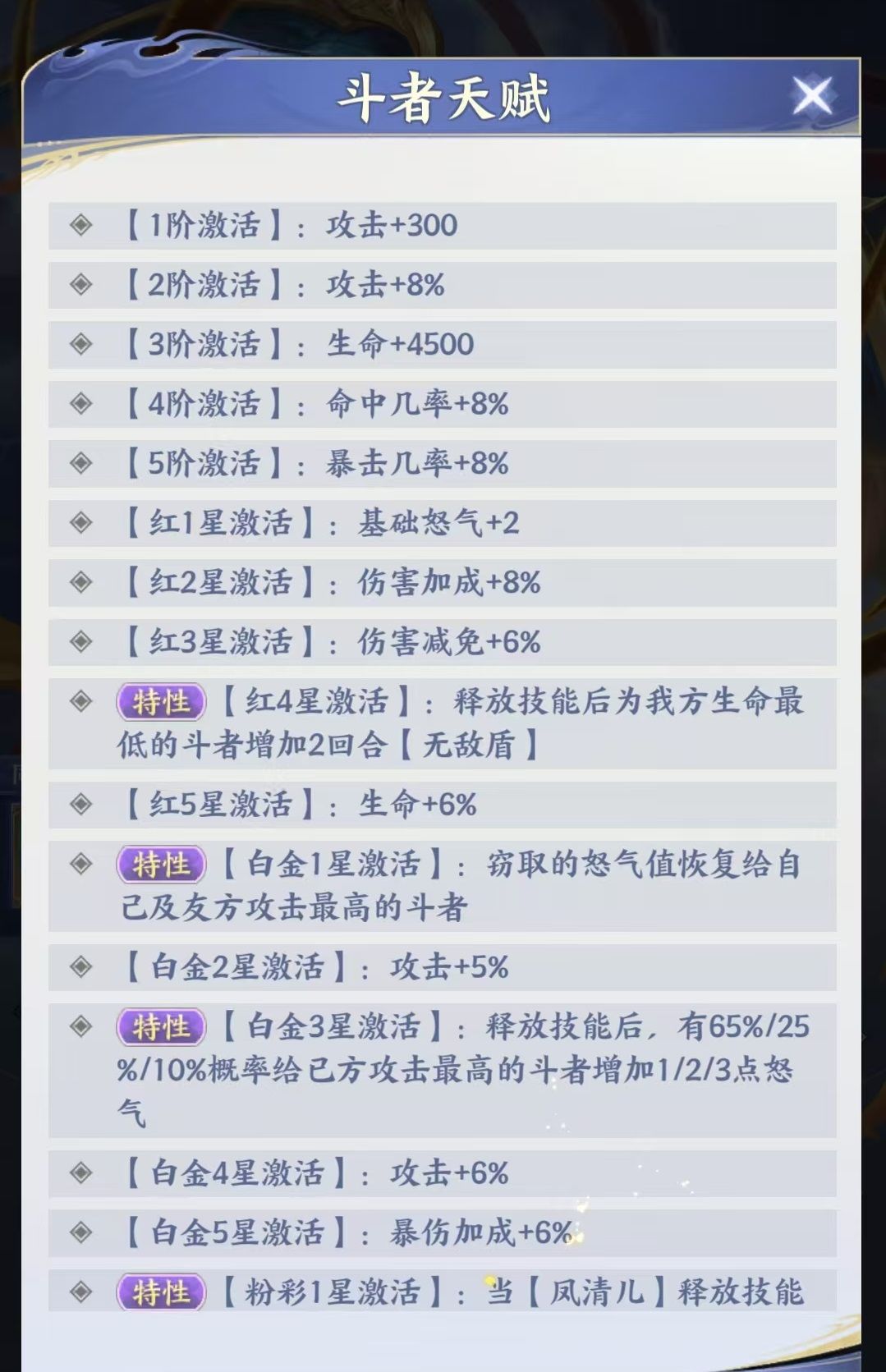 凤清儿的核心技能具备多重战略价值:一是可对敌方后排目标发动攻击并有概率窃取1点怒气,干扰对手大招释放节奏;二是当星级提升至红色四星后,技能命中后将为我方生命值最低的斗者施加持续两回合的无敌护盾,确保关键单位免于暴毙;三是晋升至白金一星时,所窃取的怒气将同步返还给己方攻击力最高的斗者;四是达到白金三星后,技能释放后额外触发概率性增益,为攻击最高单位追加怒气,既加速自身技能循环,也强化主C输出效率;五是粉彩一星阶段,凤清儿每次施放技能后,雷尊者将立即进行一次额外行动,该联动机制要求二者必须共存于阵容,否则无法激活完整效果。