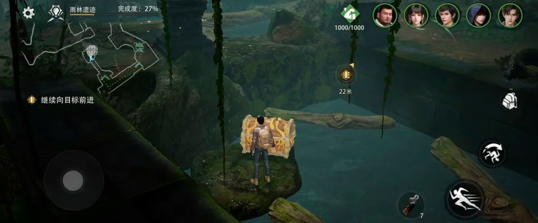 这个任务位于西王母国的雨林遗迹当中,玩家可以先将自己传送至雨林遗迹章节,跟随引导前往林地。在此处可以看到几个有石头搭建而成的桥梁,如小编在下图所展示,此时建议玩家带上吴邪并解锁罗盘装置,吴邪这一角色的解谜性能更佳,可以说是专业的解谜担当,而且解锁罗盘道具后,可以让吴邪解谜的成功率在提升20%,玩家穿过小河,然后跳跃过两座山石之间,就能够看到隐藏在山石后,水面上的漂浮宝藏箱。