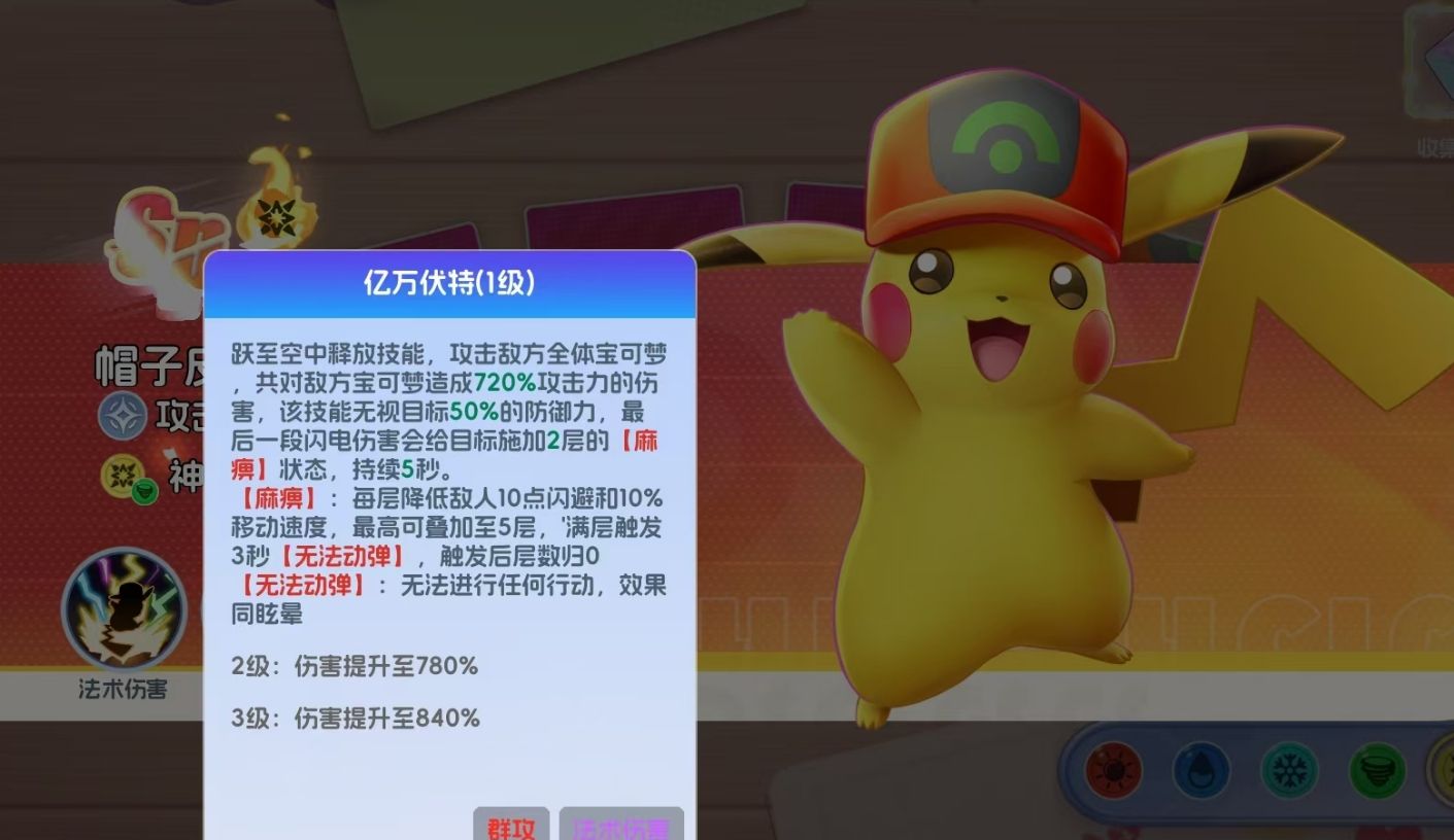 控制能力是帽子皮卡丘另一大优势。其大招、11级主动技能与41级主动技能均带有麻痹附加效果。当目标累计承受5层麻痹状态时,将立即触发“瘫痪”负面效果——该状态下敌人无法移动、无法普攻、无法释放技能,全程僵直于原地,成为我方集火的理想靶点。配合其被动技能提供的伤害规避与生存增益,帽子皮卡丘在高压战斗中具备出色的站场持续性,大幅降低被秒杀风险。