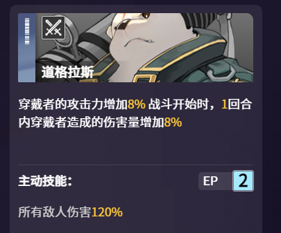 三星熊道格拉斯拥有主动和被动两个技能。他的被动技能名叫护卫,可以使穿戴者获得8%的攻击力提升。此技能还能够在战斗开始时使得责任主战员所造成的伤害总量提升8%,是一个十分万金油的增伤型技能。配合能够强力输出的主c,能够在游戏开局就对敌人造成可观的伤害。玩家们也可以耗费两点EP来使用他的主动技能巨型火箭筒,实现120%的伤害增幅。值得注意的是,这个技能是整体增益,使用后可以对全体敌人造成伤害提升。玩家们使用该技能来配合责任主战员的话,可以造成一回合内的大范围伤害,不论是清杂还是挑战boss都会很好用。