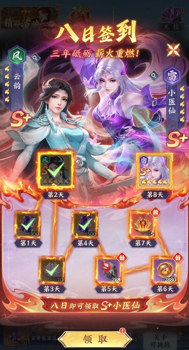 具体签到奖励节奏如下:第1日登录即赠300个紫色材料,可用于技能升级或角色升星;第2日解锁云韵角色卡,直接加入队伍;第3日发放10个升星专用道具,显著缩短主力角色成长周期;第4日再获500个紫色材料,总量达首日近两倍,建议集中用于主C或核心辅助的技能等级提升;第5日提供288个红色材料,适用于高阶装备强化或角色突破;第6日发放2880点核心资源,覆盖前期绝大多数养成消耗;第7日赠送5枚指定等级装备碎片,集齐后可合成完整橙色装备;第8日终极大奖——小医仙正式登场。