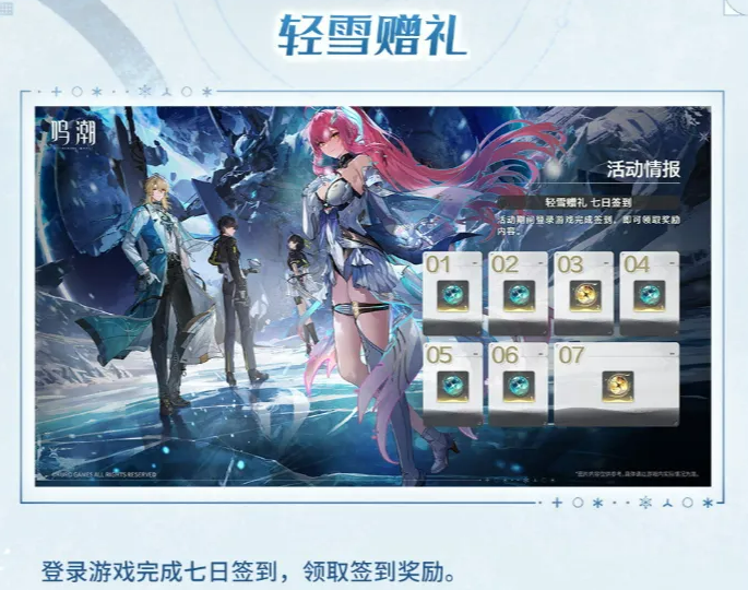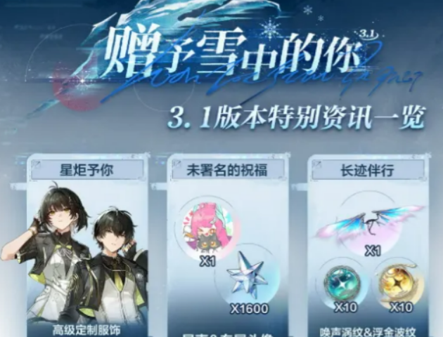 "星炬予你"是个剧情任务,把主线第三章第三幕"远航星"打完就能领奖励,漂泊者的专属服饰学院套装直接到手,还附送对应头像框,这套衣服男女主角都能穿,等于一个任务顺带拿了两套外观,性价比挺高的。签到活动叫"轻雪赠礼",连着签满七天就能拿5次常驻抽和5次限定抽,加起来10次,积少成多,攒卡阶段能多一点余地。