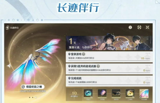 "长迹伴行"是个长期机制,靠日常任务积分,积分到位就换奖励,现在能兑换的有10次常驻抽、10次限定角色券、全新印章称号,还有一个典藏级滑翔翼皮肤可以永久免费领取,后续这个活动还会继续加奖励,积分上限也会跟着提。