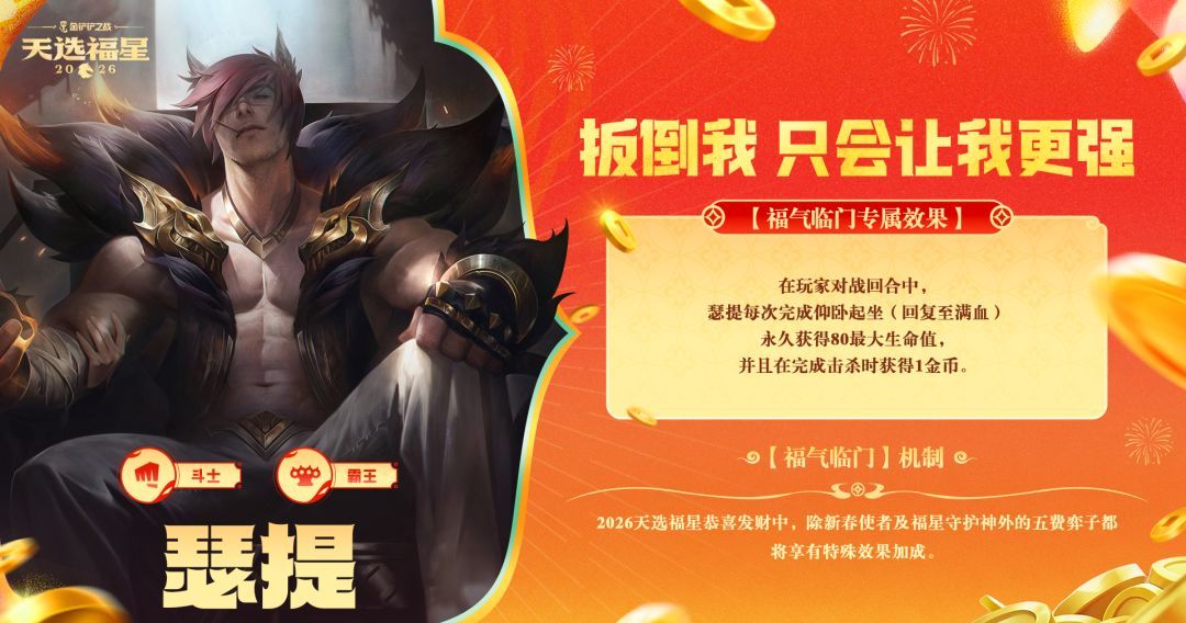 金铲铲之战2026福星恭喜发财瑟提开局阵容攻略:作为成长型后期大核,瑟提开局需优先合成法爆、正义两件套。前期用3福星过渡攒经济,中期快速上9找2星瑟提。将瑟提放第一排尽快触发仰卧起坐,起身后配合斗士羁绊即可锁血吃鸡。