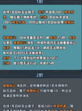 炽焰舞姬核心的战斗力主要是靠两个技能支撑,第1个阶段就可以打出不俗的效果,在提升等级之后,还能拥有翻倍的强度。一技能是核心的输出技能,在针对单个目标时,丢出扇子就可以造成200%的神圣伤害。扇子在掉落在地时,还能灼烧三个敌人,然后打出200%的神圣伤害,同时可以给随机一名敌人挂叠扇标记。这一个标记就堪称小怪克星,目标准备攻击时就会直接被魅惑1.5秒。而且禁疗还可以让敌人的治疗因此而失效,灼烧就可以直接定住小怪0.5秒,唯一遗憾的是这个技能对Boss没有效果。