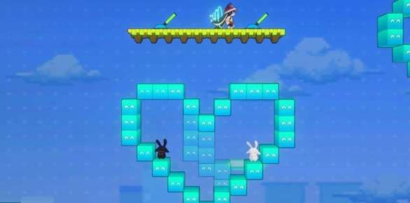 2、弹完后进到隐藏空间,跳到右边这个操作台操作2个遥杆,让2边合成一整个完整爱心就能达成【乐园变奏:兔子坡】成就