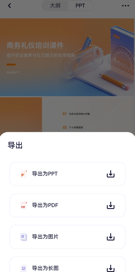 千问app怎么生成ppt,向右滑动输入框上面的功能,找到【PPT创作】,选择PPT使用的场景、页数和语言要求以及模板,也可以在输入框内输入更加详细的要求和PPT主题,全部输入完成后点击右下角,输出完PPT大纲之后,点击【去生成PPT】,等待一会就会生成全部内容的PPT,你可以更换模板或者直接导出,选择你需要的导出格式并点击右边的下载按钮即可。