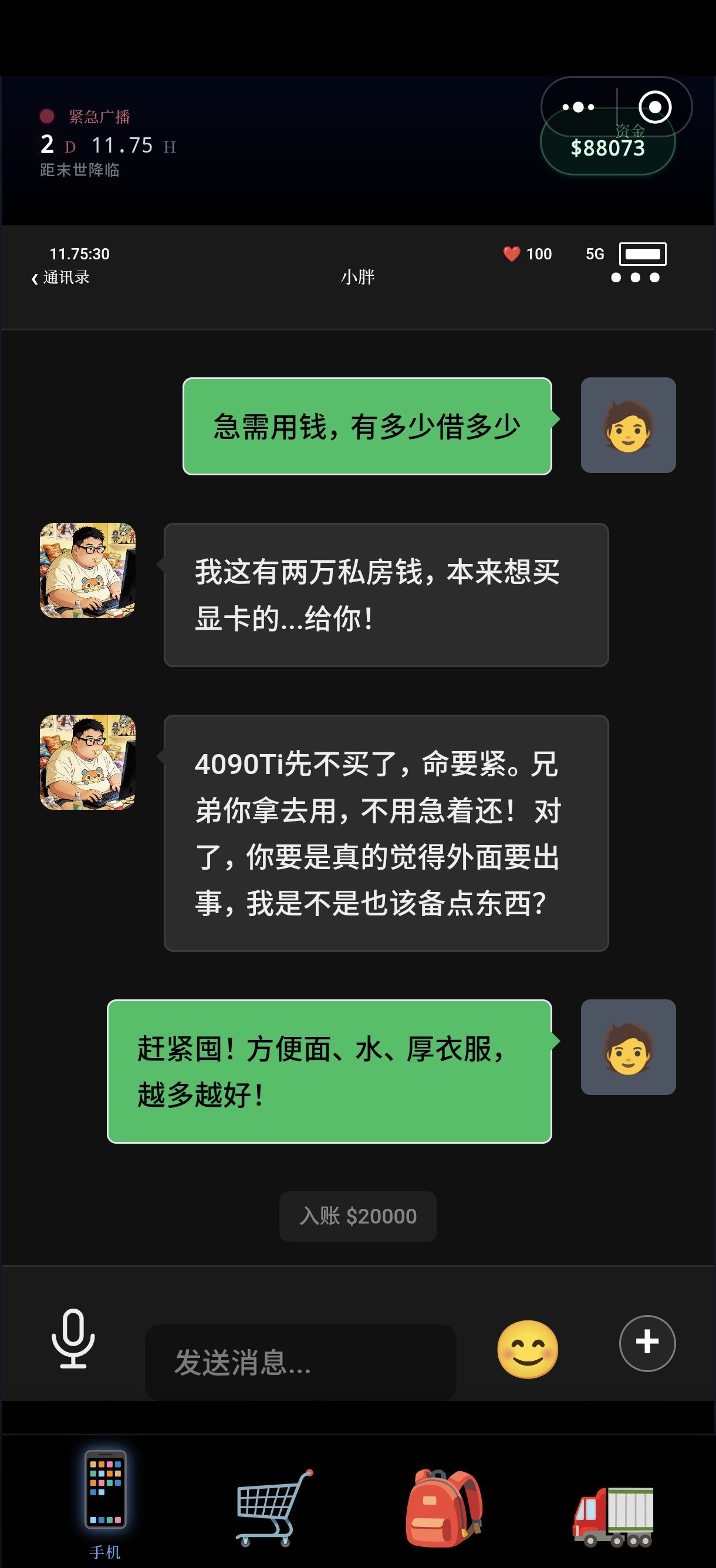 留一点钱 背包升满 每天买满吃喝:康师傅,压缩饼干,纯净水,可乐,火腿肠,冰可乐
