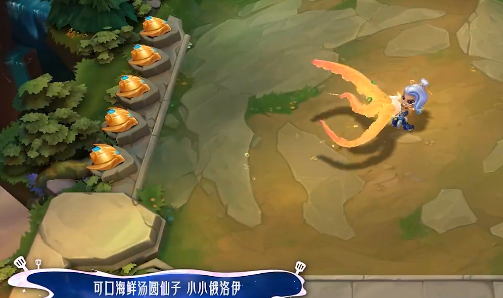 2、专属淘汰特效:用粗壮的汤圆触手缠住敌方小小英雄,拖拽到一个冒着热气的迷你海鲜汤锅上方;敌方被包裹进金色蒸汽后,会化作几颗小汤圆粒子消散。俄洛伊还会做「掀锅盖」的收尾动作,音效搭配咕嘟冒泡声,趣味性拉满。