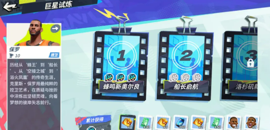 另一玩法“巨星试练”归属休闲副本系统,需玩家已拥有对应球星后方可解锁。副本以真实球员生涯高光为蓝本设计,如“飞天魔兽”还原篮板与封盖爆发场景,“空位之神”聚焦无球跑位与接投节奏,“克城之子”再现关键球处理逻辑。每关设有明确通关条件(如限定时间得分、特定动作命中数、不失误完成连招等),满足条件方可获得星级评定,非无脑推进即可通关。