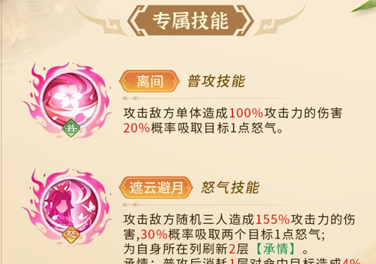 貂蝉的技能主要就是围绕控怒,还有叠伤。离间属于普通攻击,在针对单个敌人时就可以造成100%的攻击力伤害,并且还有20%的概率能吸走目标一点怒气,主要是克制那些靠大招打输出的敌方核心。遮云避月属于一个怒气技能,这更是核心中的核心,随机攻击敌方三人,就会造成155%的攻击力伤害,并且还有30%的概率可以吸取两个目标各一点怒气。血量越高,那反噬也就越狠,同列的队友还能共享这一个效果。