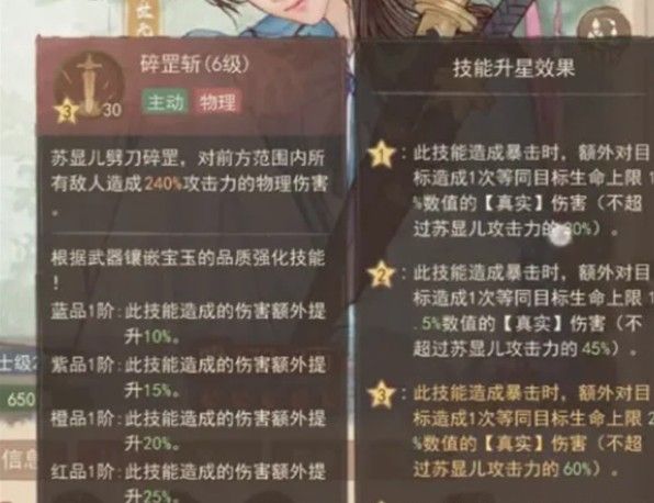 1、兵种技能点完,直接冲四技能!这个技能效果很直白,就是提升物理伤害,和苏显儿的输出定位完美契合,属于实打实的伤害加成。