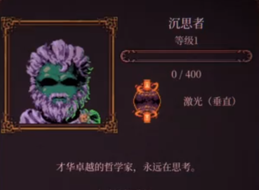 玩家们需要从众多英雄中选择一些,去对抗深坑之中遍布的穷凶极恶的怪物们,而沉思者就是之中之一。深思者顾名思义,他是一位才华卓越的哲学家,始终在保持着思考。他的能力是可以打出垂直的激光,玩家可以通过升级来提升他的能力。