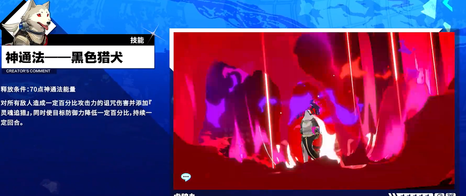 神通法叫黑色猎犬,消耗70点能量,打全体诅咒伤害,同时给所有敌人附上灵魂追猎,还能让敌人防御力降一段时间,这个技能算是整个输出循环的启动器,先用神通法把灵魂追猎铺上去,后面三个面具技能,才能发挥出更大的价值。虎狼丸的援助技能也比较实用,能永久降低所有敌人的防御力,同时给自己回一些神通法能量,这个永久降防的效果叠几次之后,全队的伤害都会有明显的变化。
